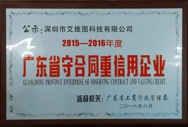 2017年09月,經(jīng)廣東省工商行政管理局評審委員會評審通過,近日公布了2016年“廣東省守合同重信用”名單,深圳市艾維圖科技有限公司獲此殊榮。