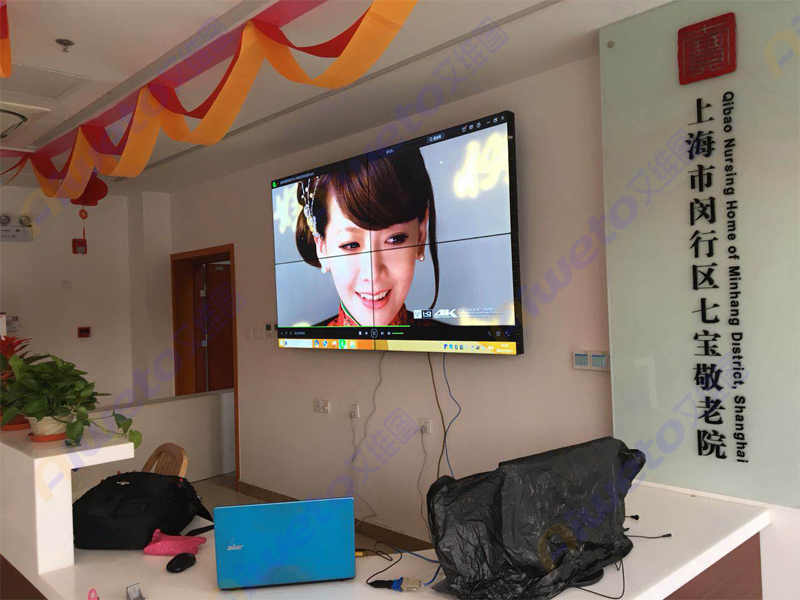 根據(jù)上海閔行區(qū)七寶敬老院的實(shí)際情況, 本來按效果來說應(yīng)該安裝液壓前維護(hù)支架式,但是由于一些原因,只能安裝成了壁掛,這也是一大瑕疵。但是這款2X2的壁掛液晶拼接系統(tǒng)也為上海閔行區(qū)七寶敬老院的所有工作人員促進(jìn)了工作效率,從節(jié)能、顯示方式、超高的清晰度等眾多優(yōu)勢(shì),無一不彰顯出液晶拼接屏的獨(dú)特魅力。