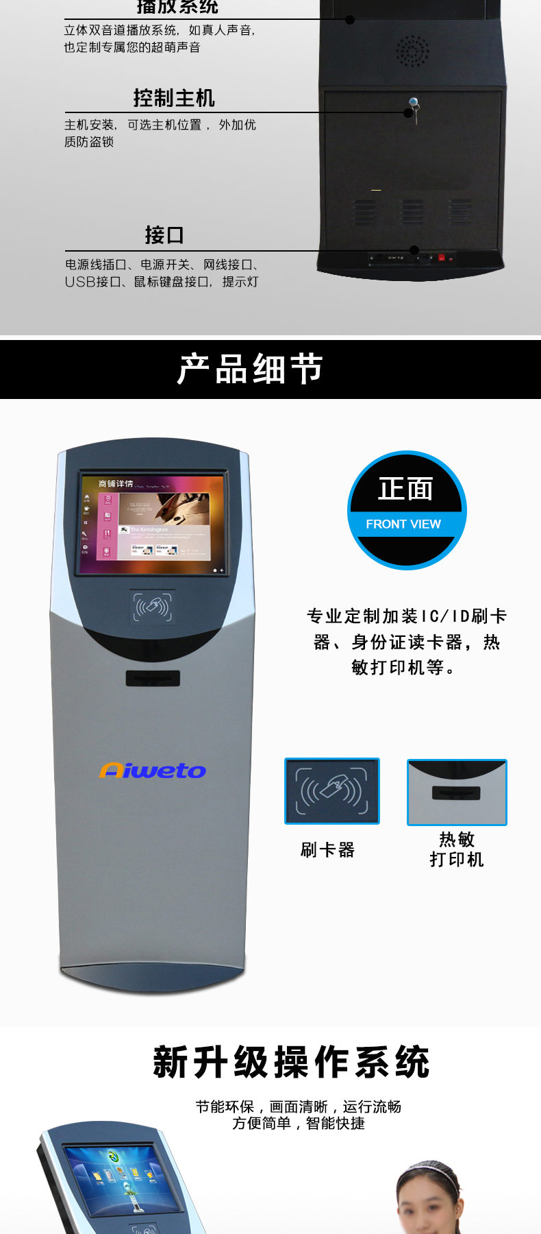 人體機(jī)學(xué)造型設(shè)計:人性化機(jī)型設(shè)計,符合人體站立姿態(tài)使用機(jī)器及視覺查看屏幕的最佳角度貼心細(xì)節(jié)設(shè)計,只為您使用更便捷。