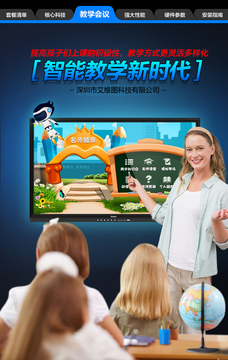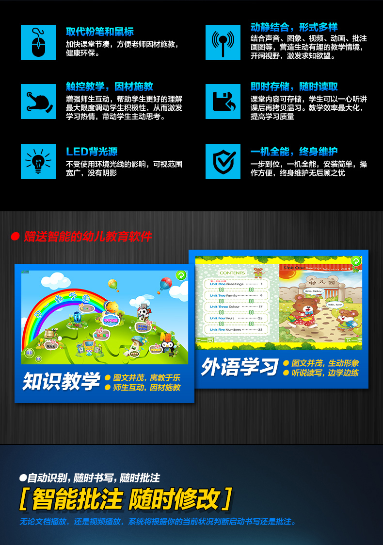 AW系列-多媒體教學一體機,高清大屏顯示,壁掛支架多種使用方式,人性化機型設計,立式與掛式兩種使用方法可交替使用,避免使用環(huán)境發(fā)生變化時產生的資源浪費問題采用LED背光源長壽命,低功耗,環(huán)保節(jié)能。智能電子白板,各種文件一鍵加載,多點觸控智能電子白板適用于各種商務會議,支持手寫批注,兼容日常office辦公軟件,本地、U盤、網盤、局域網數(shù)據輕松駕馭。書寫流暢,減少視覺誤差,高端企業(yè)必備,多重主題背景,筆形色彩,任意選擇。高端配置 讓運行速度,完美兼容WIN7,WIN8 隨意切換。