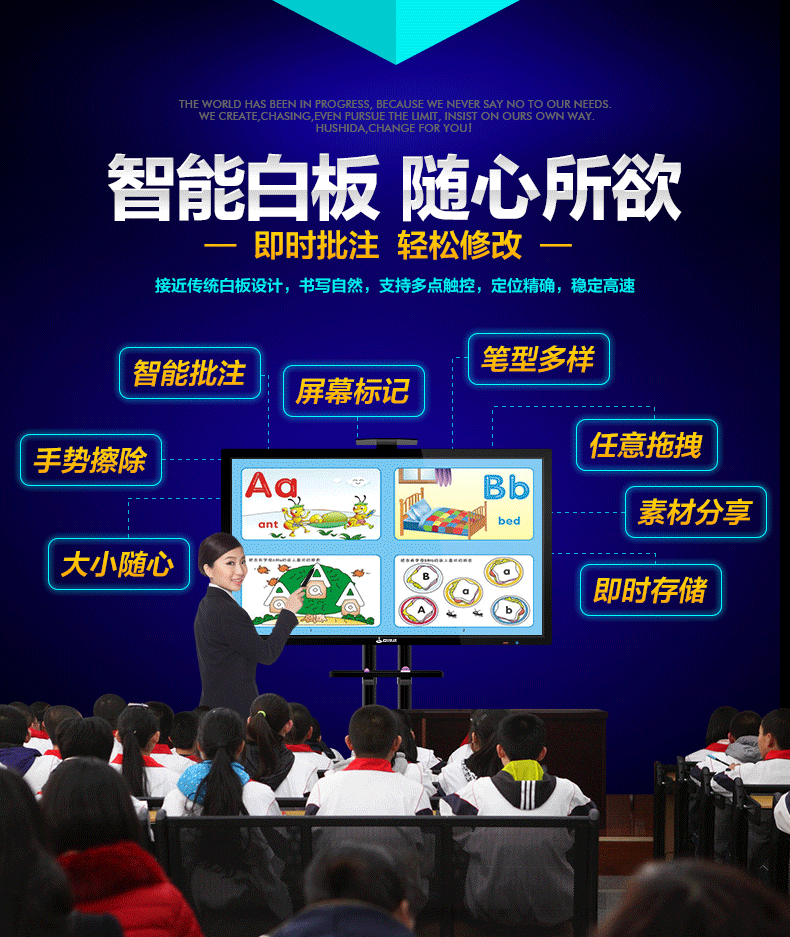 AW系列-多媒體教學(xué)一體機,高清大屏顯示,壁掛支架多種使用方式,人性化機型設(shè)計,立式與掛式兩種使用方法可交替使用,避免使用環(huán)境發(fā)生變化時產(chǎn)生的資源浪費問題采用LED背光源長壽命,低功耗,環(huán)保節(jié)能。智能電子白板,各種文件一鍵加載,多點觸控智能電子白板適用于各種商務(wù)會議,支持手寫批注,兼容日常office辦公軟件,本地、U盤、網(wǎng)盤、局域網(wǎng)數(shù)據(jù)輕松駕馭。書寫流暢,減少視覺誤差,高端企業(yè)必備,多重主題背景,筆形色彩,任意選擇。高端配置 讓運行速度,完美兼容WIN7,WIN8 隨意切換。